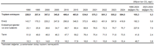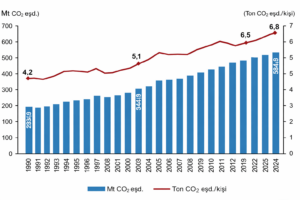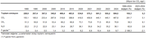 Türkiye İstatistik Kurumu’nun (TÜİK) 1990-2024 tarihli Sera Gazı Emisyon İstatistikleri’ne göre; toplam sera gazı emisyonu 2024 yılında 584,5 Mt CO2 eşdeğeri oldu. Sera gazı envanteri sonuçlarına göre ise 2024 yılı toplam sera gazı emisyonu bir önceki yıla göre yüzde 5,3 artarak 584,5 milyon ton (Mt) CO2 eşdeğeri (eşd.) olarak kaydedildi. Kişi başı toplam sera gazı emisyonu 1990 yılında 4,2 ton CO2 eşd., 2023 yılında 6,5 ton CO2 eşd. ve 2024 yılında 6,8 ton CO2 eşd. olarak hesaplandı.